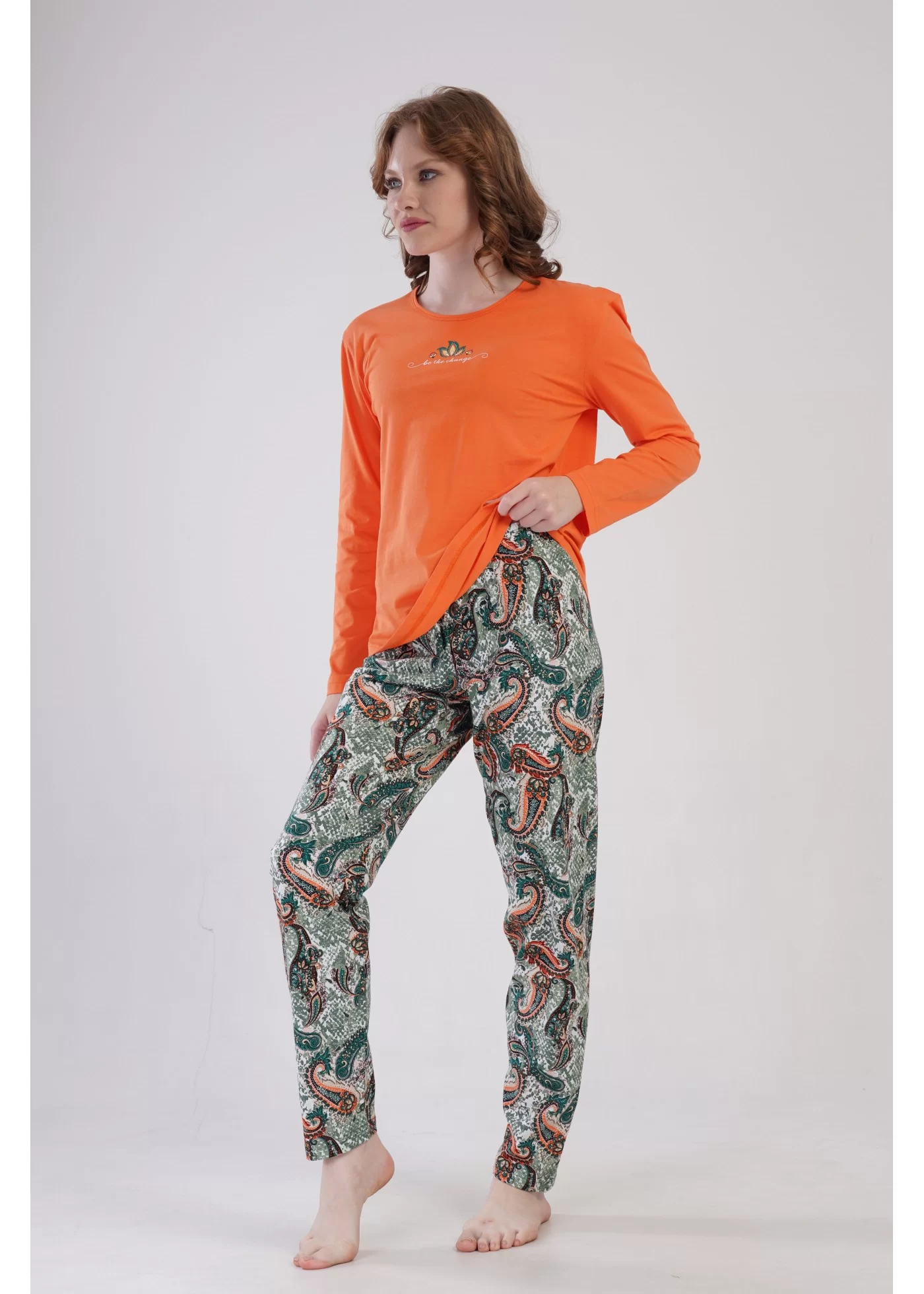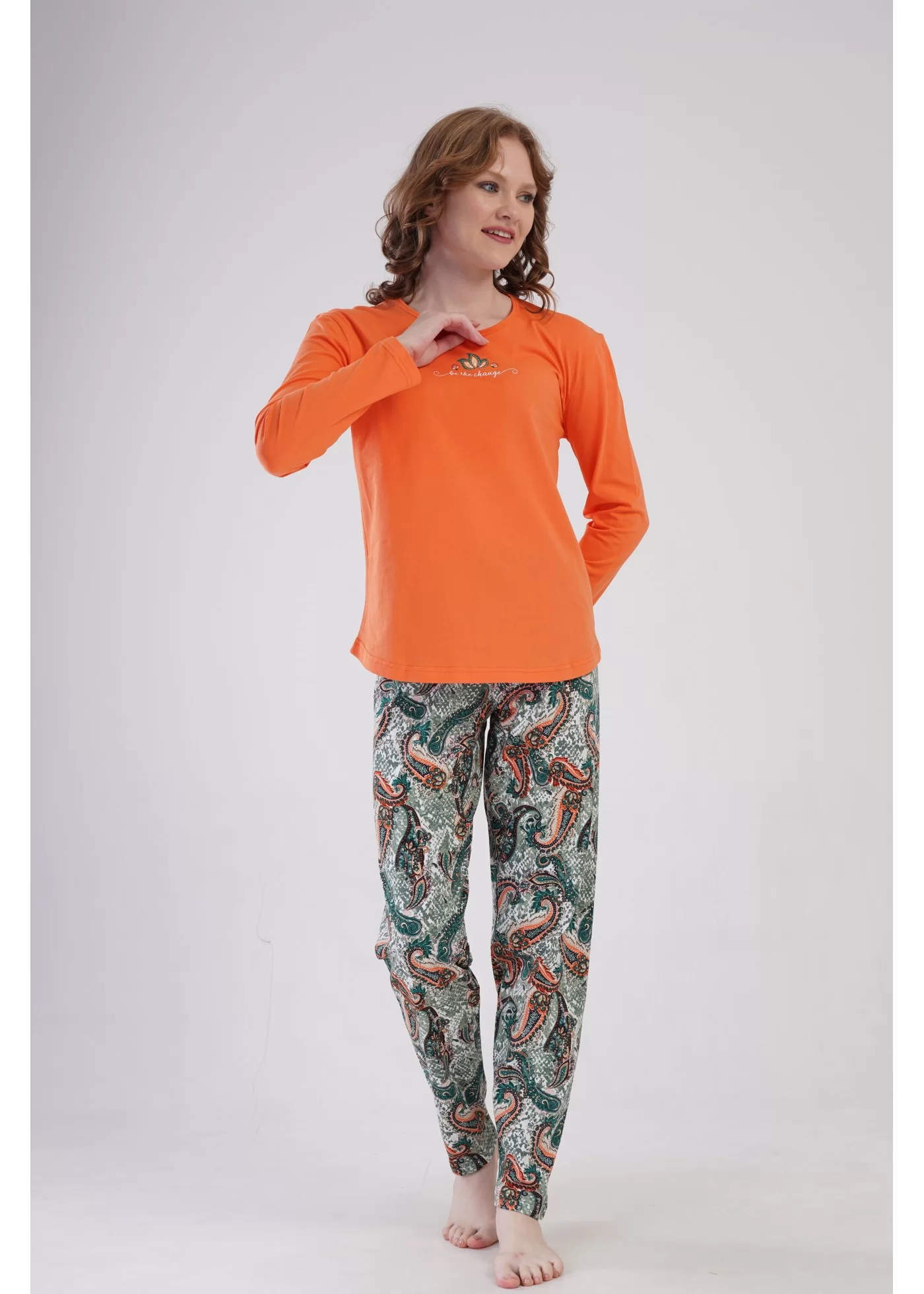 Compleu pijama alcatuit din bluza uni cu desen imprimat pe piept,si pantalon lung imprimat.